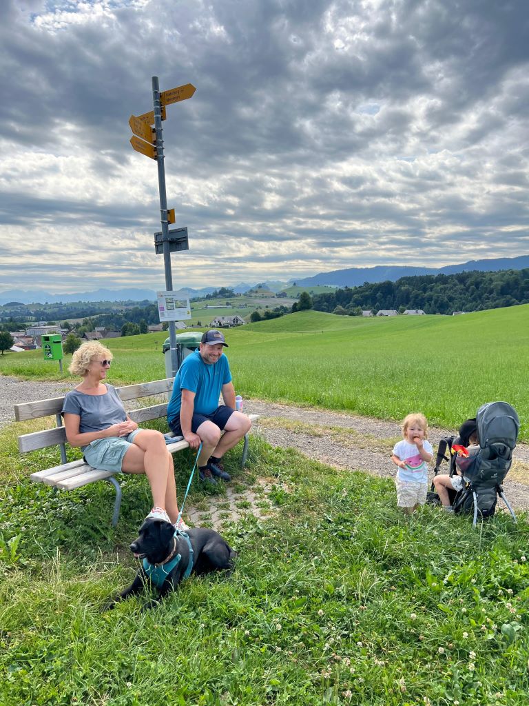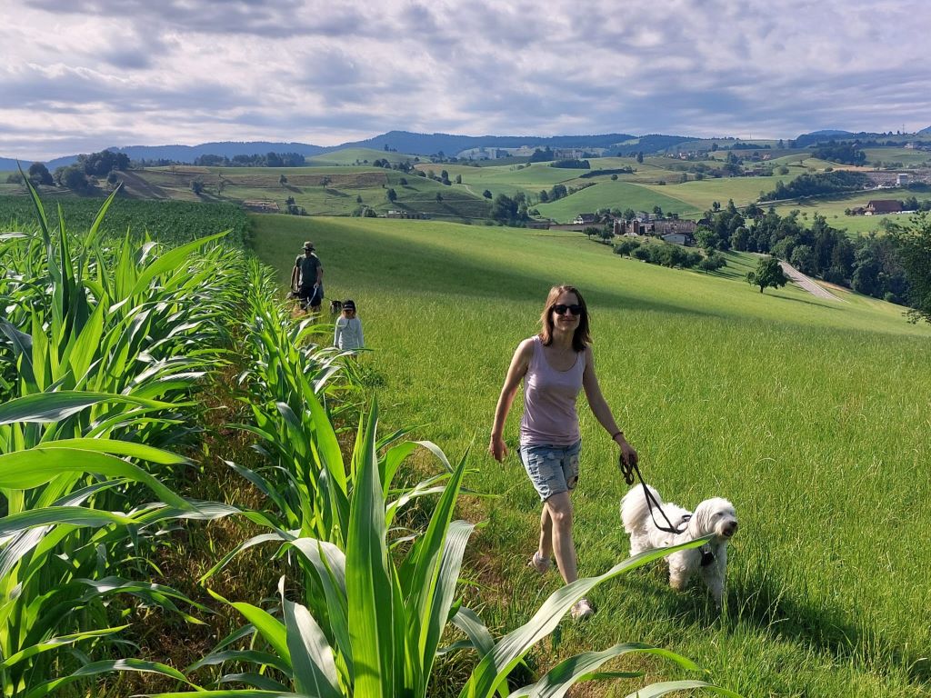 Wir zogen los, ganz gemütlich querfeldein über blühende Wiesen mit friedlich grasenden Kühen und entlang dunkelgrünen Mais-Felder. Die Hunde schnupperten sich fröhlich durch den Morgen, während wir plauderten, lachten und die Aussicht genossen. Wir erklommen einen sanften Hügel – dort oben blieb man fast automatisch stehen, so schön war der Blick über den Zugersee, die weiten Feldern und Hügel mit den Geburtslinden. Anschliessend führte uns ein kurzes Stück durch Neuheim.