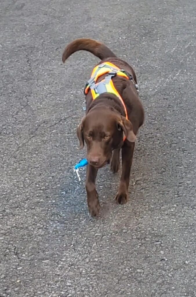 Das dritte Team vertiefte das Bringselverweisen. Ein Rucksack wurde versteckt, und der Hund – ausgestattet mit einem Bringsel am Halsband – machte sich auf die Suche. Nach dem Fund nahm er den Bringsel ins Maul und brachte ihn seinem Menschen zurück. Mit dem Kommando „zeige“ führte er diesen dann zielsicher zum Versteck. Eine tolle Übung, die nicht nur den Geruchssinn, sondern auch die Kommunikation zwischen Mensch und Hund stärkt.